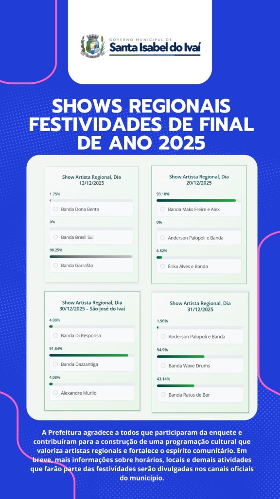 A Prefeitura de Santa Isabel do Ivaí torna público o resultado da enquete realizada com a população para definir a programação de shows regionais que farão parte do calendário festivo do município no mês de dezembro de 2025. A participação expressiva dos moradores reforça o compromisso da administração municipal com a construção de decisões compartilhadas e alinhadas aos interesses da comunidade.